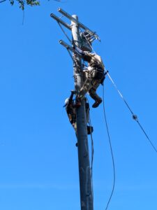 山の中なので、高所作業車が入れず昇柱作業。真夏の昇柱作業は、大変です!